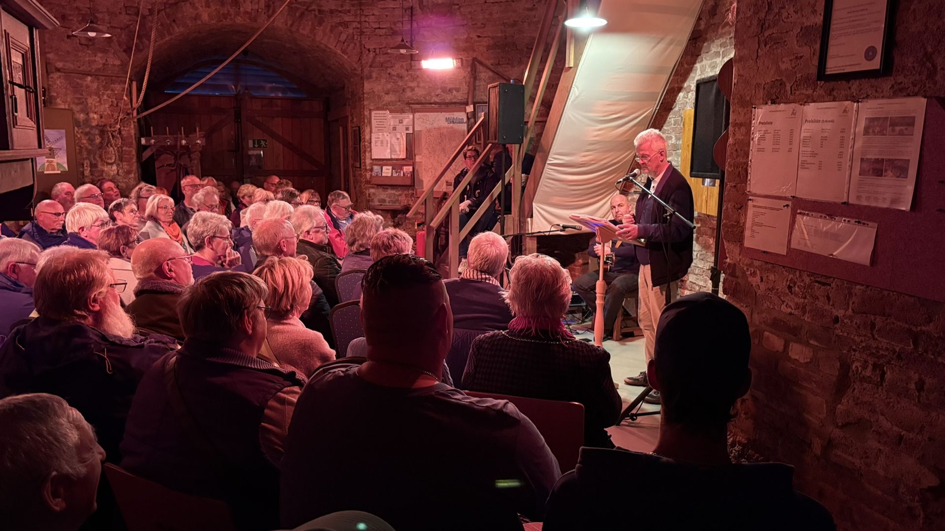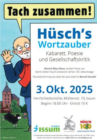 Vollbesetzte Reihen, fröhliche Gesichter und minutenlanger Applaus: Die Veranstaltung „Hüsch’s Wortzauber“ am 3. Oktober 2025 in der Herrlichkeitsmühle war ein voller Erfolg. Unter dem Motto „Kabarett, Poesie und Gesellschaftskritik“ rezitierte Hinrich Kley-Olsen ausgewählte Texte von Hanns Dieter Hüsch – anlässlich dessen 100. Geburtstags.