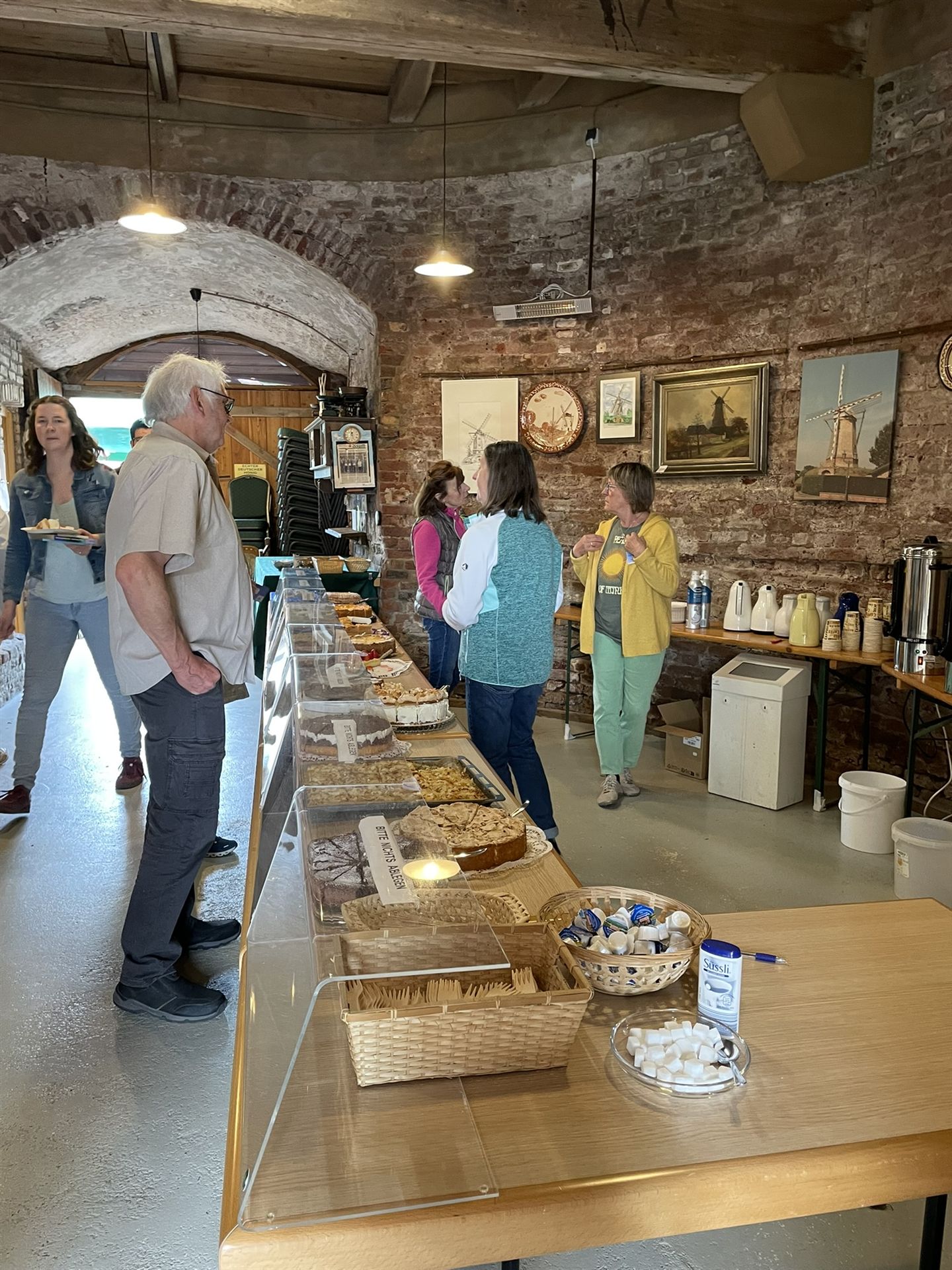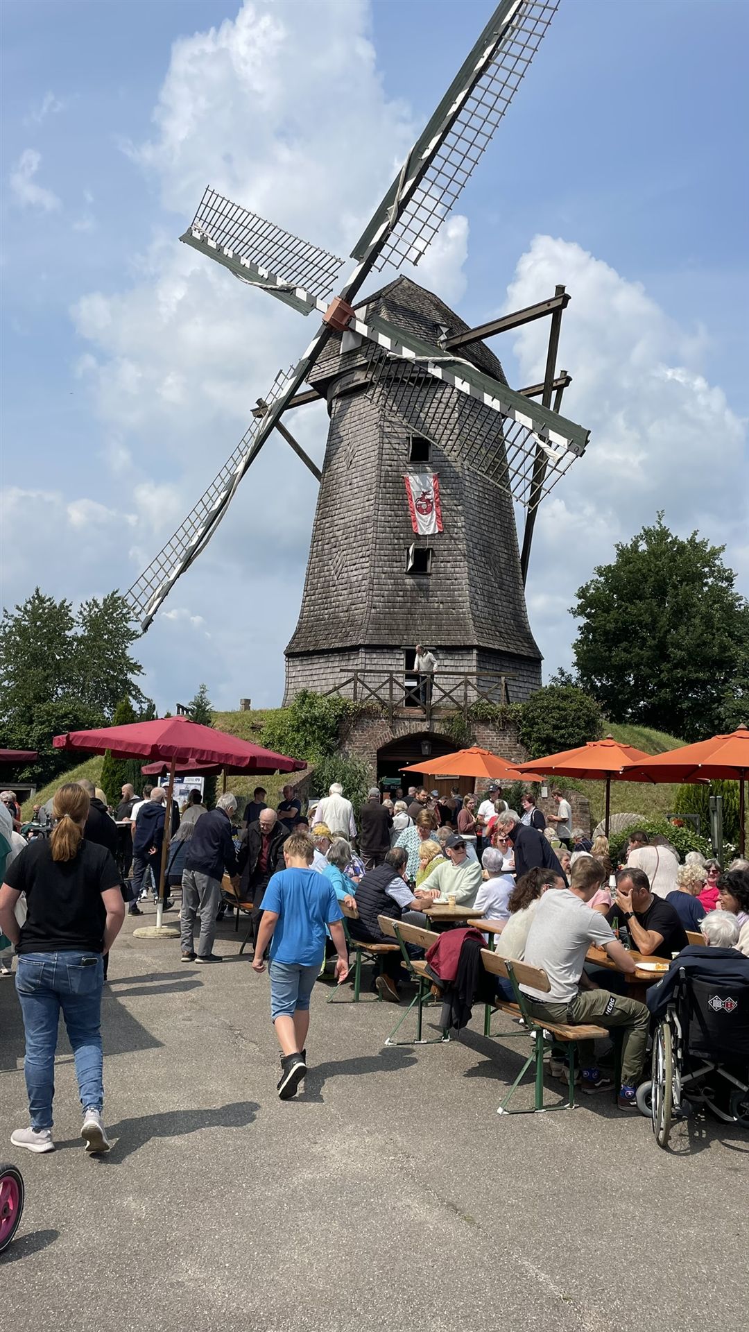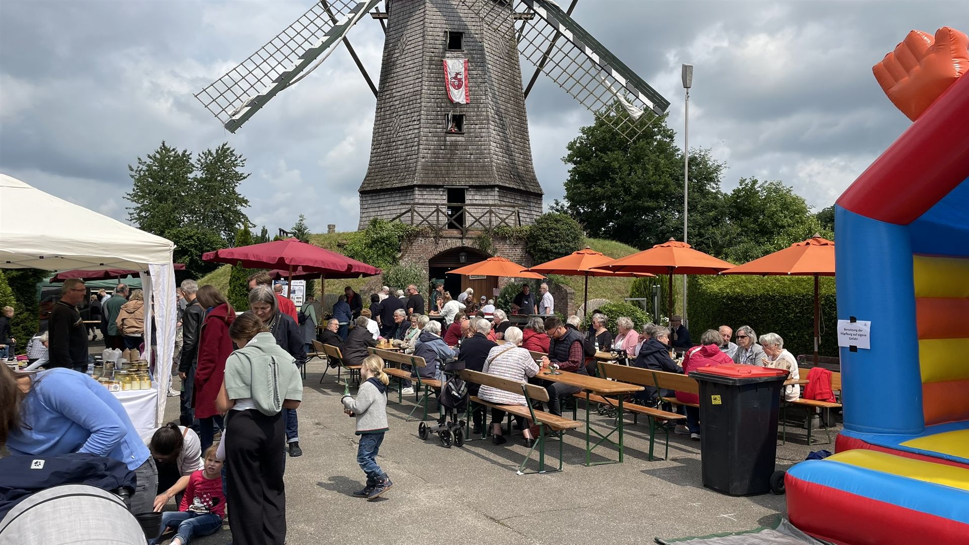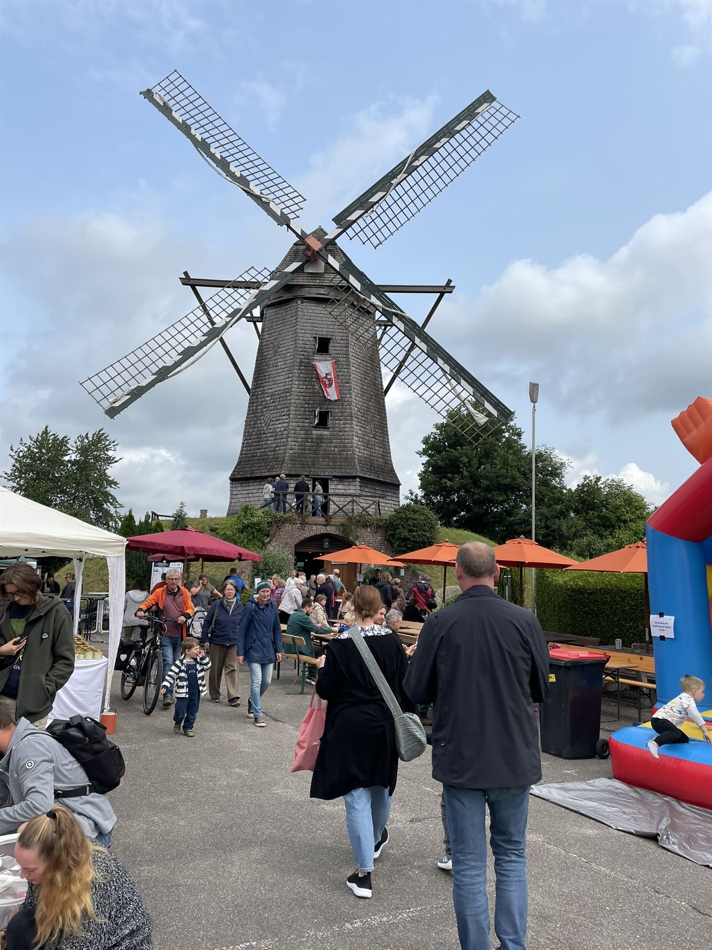 Auch wenn der Wind leider nicht stark genug war, die Flügel in Bewegung zu setzen, bot das Programm für Groß und Klein viel zu entdecken, wie zum Beispiel der Verkauf von selbst gemahlenem Mehl sowie regionalem Honig und Rübenkraut, einen Kindertrödelmarkt und eine Hüpfburg für die Kleinsten.